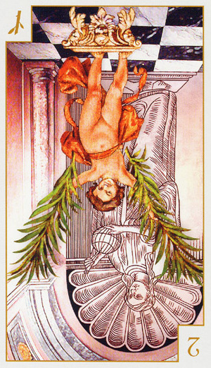The 2 of Wands represents the research and digestion of a new idea. The number of this card and it's element are somewhat in conflict; while the 2 is focussed inwards, the Wand's element fire is outgoing. Fire wants to steam ahead while the blackbox 2 asks for patience.