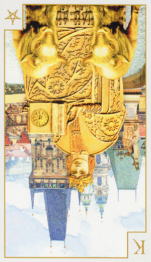 The King of Pentacles uses his Earthly attributes to rule. He goes about his work like an old style business man; he avoids unnecessary risks, aims for real results, and acts from confidence.