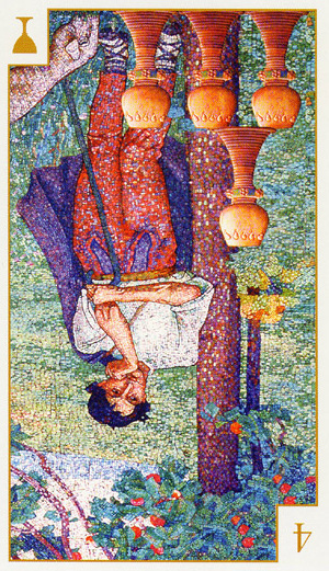 With the 4, the second cycle of this suit is commenced, where a choice between structure and feeling has to be made, where old securities have to be let go of to work towards a new future. But like Wands, Cups don't like structure much, they prefer to be free and dream rather than to make commitments and go for something.