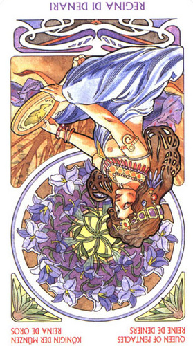 The Queen in the suit of Pentacles becomes aware of her Earthly attributes; she's reliable and sober, able to give good advice.