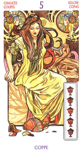 The 5 of Cups is about overcoming sadness and disappointment. You've let go of your old securities to embrace the new and exciting, now something has gone awry and you feel bad about that. But don't forget to notice those things that did go right.