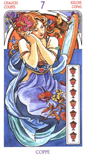 The 7 of Cups is about making a choice between different ideals. But Cups, with the water element, don't like making definitive choices that much, making this 7 in this suit a bit of a hard choice.