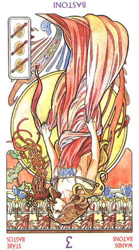 This card is about exposing your new ideas to the world. The Wand's element fire goes well with the number 3, as 3 is an output number, a number of results. Fire likes getting to results quickly.