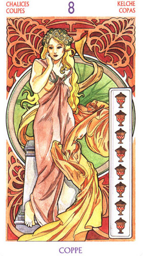 8 is an assignment number, and in the suit of Cups, it is about overcoming the urge to sink into depression caused by view on the long road ahead.