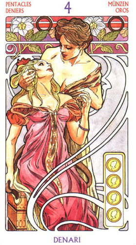 The 4 of Pentacles is about holding on to what you got. The number 4 represents structure and order, and fits well with the suit's element, Earth.