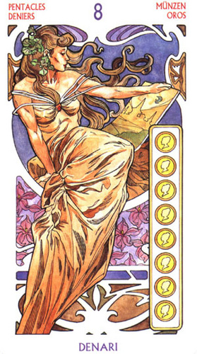The 8 of Pentacles is about keeping up the hard work you're doing, and trying to be happy about doing that work at the same time. While the 3 of Pentacles is about completing a masterpiece, the 8 of Pentacles is about doing the apprentice work that makes you a master of your trade.