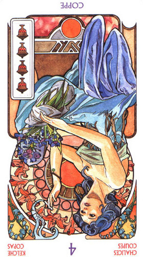 With the 4, the second cycle of this suit is commenced, where a choice between structure and feeling has to be made, where old securities have to be let go of to work towards a new future. But like Wands, Cups don't like structure much, they prefer to be free and dream rather than to make commitments and go for something.