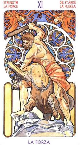 This card carries the number 11. In the Rider-Waite deck, Strength and Justice have swapped places because Waite saw links with the astrological signs Leo and Libra.