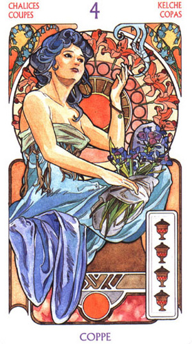 With the 4, the second cycle of this suit is commenced, where a choice between structure and feeling has to be made, where old securities have to be let go of to work towards a new future. But like Wands, Cups don't like structure much, they prefer to be free and dream rather than to make commitments and go for something.