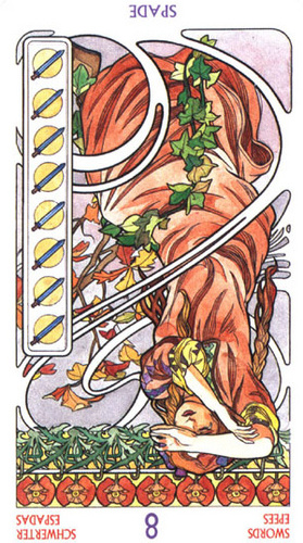 The 8 of Swords is about slowly regaining strength and energy. The 8 is an assignment number, and in the element of Swords it's a bit harder than usual.