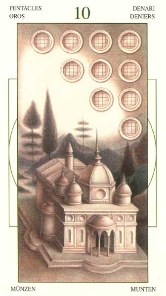 The 10 of Pentacles represents material posessions. The number 10 of Pentacles forms the links to the Ace (first card) of Wands (the first suit in the minor Arcana), and thus prepares to bring you back to the beginning of the minor Arcana, ready for a next cycle through the tarot.
