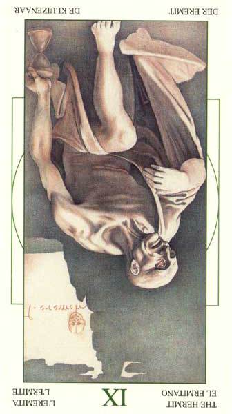 The Hermit carries the number 9. This is the highest base number. After 9 the composed numbers emerge. Therefore the number 9 is the gateway to a higher order. It is also a place to rest before embarking on the next leg of the journey.