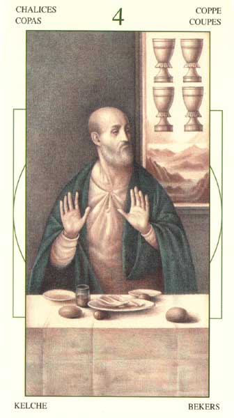 With the 4, the second cycle of this suit is commenced, where a choice between structure and feeling has to be made, where old securities have to be let go of to work towards a new future. But like Wands, Cups don't like structure much, they prefer to be free and dream rather than to make commitments and go for something.