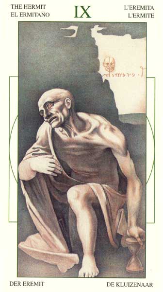 The Hermit shuts out the world and retreats into solitude to better understand some spiritual aspect of life. He opens to the cosmos and lets it's wisdom sink in. Hermits are often seen as wise old men who can guide a traveller along a journey.