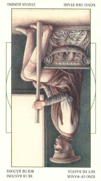 The King of Wands uses the properties of Wands (vitality, optimism, enthousiasm) to go out with confidence. He is seen as a leader with charisma.