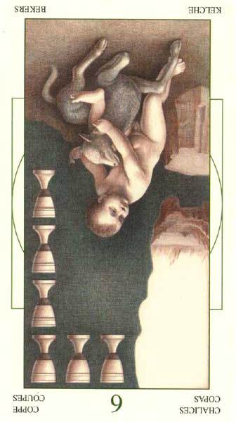 With the 4, the second cycle of this suit is commenced, where a choice between structure and feeling has to be made, where old securities have to be let go of to work towards a new future. But like Wands, Cups don't like structure much, they prefer to be free and dream rather than to make commitments and go for something.