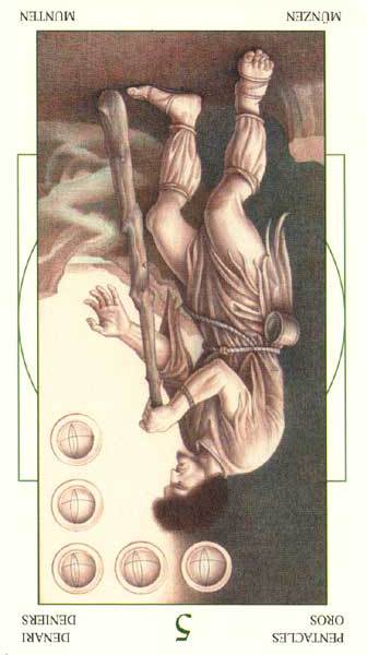 The 5 of Pentacles is an assignment-number card, and is about letting go of your securities. Pentacles element Earth (also) represents material posessions, so this card is about letting go of (some of) your worldly assets.