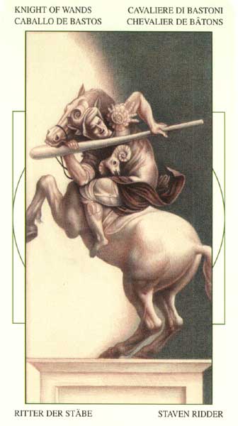 The Knight of Wands likes action and progress, but isn't too concerned with the usefulness of his actions or the ramifications to those around him.