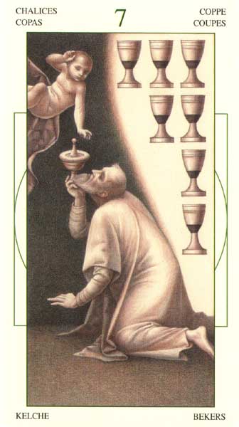 The 7 of Cups is about making a choice between different ideals. But Cups, with the water element, don't like making definitive choices that much, making this 7 in this suit a bit of a hard choice.
