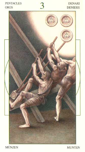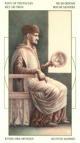 The King of Pentacles uses his Earthly attributes to rule. He goes about his work like an old style business man; he avoids unnecessary risks, aims for real results, and acts from confidence.