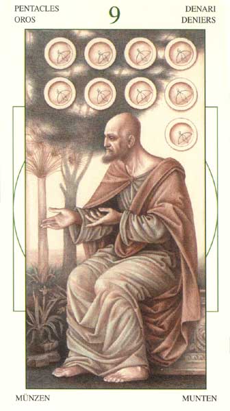 The 9 of Pentacles represents earned rest. The element Earth, attached to the Pentacles suit, appreciates the rest that completion of hard work brings. This is a good time for games and relaxation.