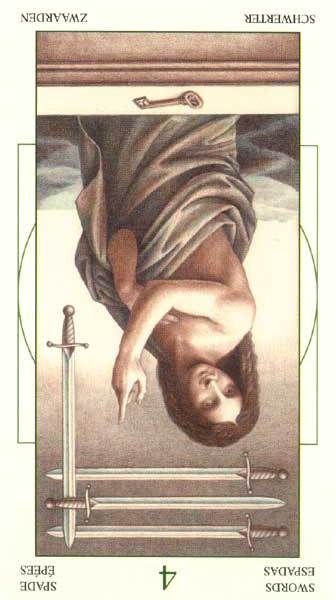 4 is the first number in the cycle of giving things shape. It's about making things real. The element of Swords also relates to making things real, so this enhances the effect so much that arrogance can cause you to exhaust yourself.