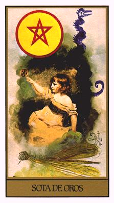 Pages explore and gather information about the road ahead, with an almost naive attitude. The Page of Pentacles is sometimes described as a bridge builder; Pentacles is the suit where the actual work is done, and the Page here enables those that follow to quickly cross difficult terrain.