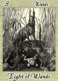 The 9 represents rest after work, which is another thing (like 8) that the element Fire associated with Wands is not very comfortable with. Fire likes to keep going. This rest will probably be spent thinking about what to do next along the course to completion.