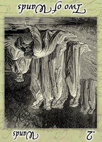 The 2 of Wands represents the research and digestion of a new idea. The number of this card and it's element are somewhat in conflict; while the 2 is focussed inwards, the Wand's element fire is outgoing. Fire wants to steam ahead while the blackbox 2 asks for patience.