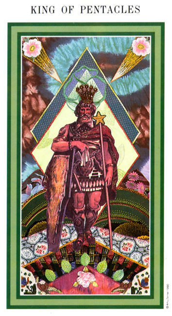The King of Pentacles uses his Earthly attributes to rule. He goes about his work like an old style business man; he avoids unnecessary risks, aims for real results, and acts from confidence.