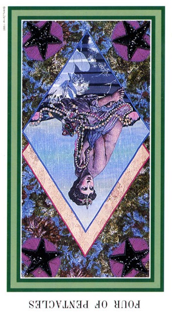 The 4 of Pentacles is about holding on to what you got. The number 4 represents structure and order, and fits well with the suit's element, Earth.