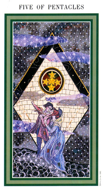 The 5 of Pentacles is an assignment-number card, and is about letting go of your securities. Pentacles element Earth (also) represents material posessions, so this card is about letting go of (some of) your worldly assets.