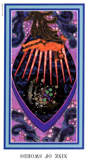 The 9 of Swords represents relief from cropped-up grief. The number 9 is a number of reward and rest and accomplishment. In the element of Swords there is not a lot of time for rest, but without any rest you'd just burn yourself out.