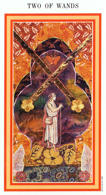 The 2 of Wands represents the research and digestion of a new idea. The number of this card and it's element are somewhat in conflict; while the 2 is focussed inwards, the Wand's element fire is outgoing. Fire wants to steam ahead while the blackbox 2 asks for patience.