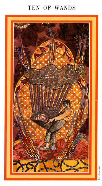 The 10 of Wands is therefore the transition from the element Fire (associated with Wands) to the element Water, associated with Cups. As you might imagine, this not the easiest of transitions.
