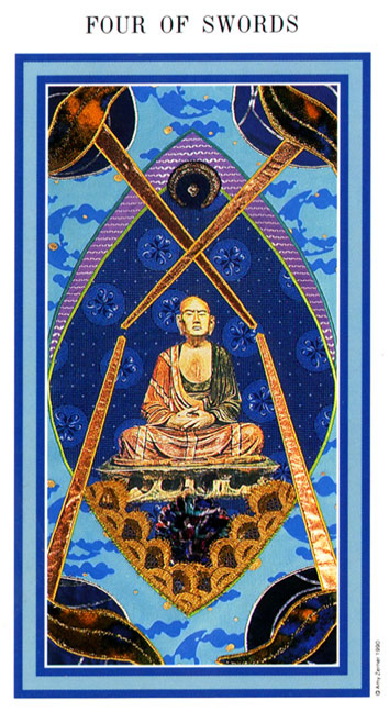 4 is the first number in the cycle of giving things shape. It's about making things real. The element of Swords also relates to making things real, so this enhances the effect so much that arrogance can cause you to exhaust yourself.