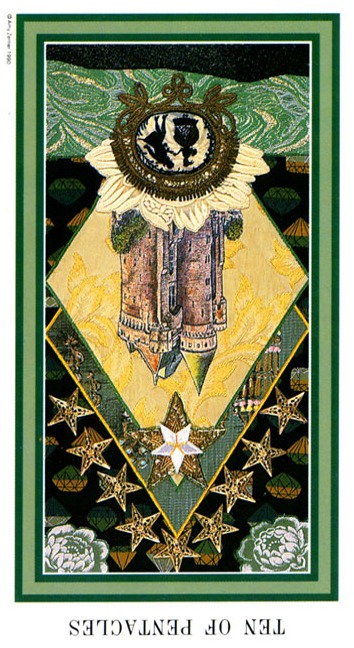 The 10 of Pentacles represents material posessions. The number 10 of Pentacles forms the links to the Ace (first card) of Wands (the first suit in the minor Arcana), and thus prepares to bring you back to the beginning of the minor Arcana, ready for a next cycle through the tarot.