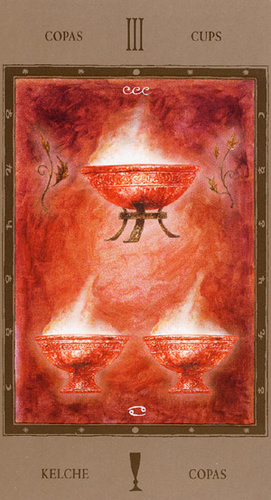 The 3 of Cups represents hope, faith and love. The 3 is a reward number and in this suit of Cups your feelings during that number will be that of joy and self-contentment.