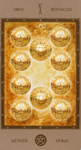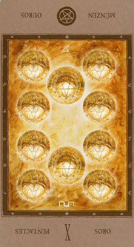 The 10 of Pentacles represents material posessions. The number 10 of Pentacles forms the links to the Ace (first card) of Wands (the first suit in the minor Arcana), and thus prepares to bring you back to the beginning of the minor Arcana, ready for a next cycle through the tarot.