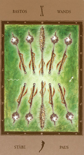 The 10 of Wands is therefore the transition from the element Fire (associated with Wands) to the element Water, associated with Cups. As you might imagine, this not the easiest of transitions.