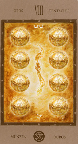 The 8 of Pentacles is about keeping up the hard work you're doing, and trying to be happy about doing that work at the same time. While the 3 of Pentacles is about completing a masterpiece, the 8 of Pentacles is about doing the apprentice work that makes you a master of your trade.