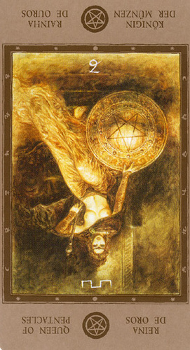 The Queen in the suit of Pentacles becomes aware of her Earthly attributes; she's reliable and sober, able to give good advice.