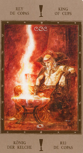 The King of Cups uses his intuition to achieve his ideals. Since Cups are turned inward, and Kings turned to the outside world, this card might be a difficult one, or it could be a powerful one.