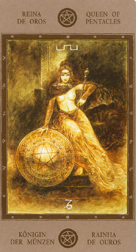 The Queen in the suit of Pentacles becomes aware of her Earthly attributes; she's reliable and sober, able to give good advice.