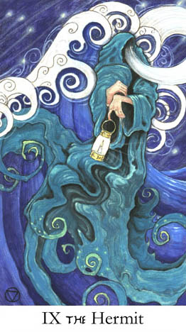 The Hermit shuts out the world and retreats into solitude to better understand some spiritual aspect of life. He opens to the cosmos and lets it's wisdom sink in. Hermits are often seen as wise old men who can guide a traveller along a journey.