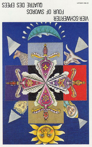 4 is the first number in the cycle of giving things shape. It's about making things real. The element of Swords also relates to making things real, so this enhances the effect so much that arrogance can cause you to exhaust yourself.