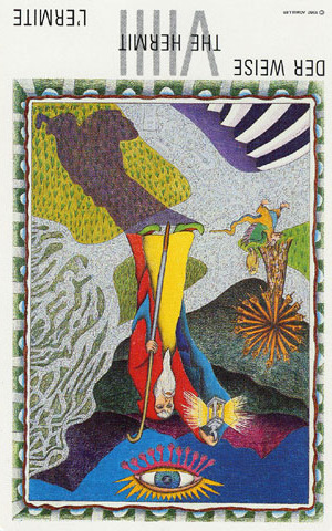 The Hermit shuts out the world and retreats into solitude to better understand some spiritual aspect of life. He opens to the cosmos and lets it's wisdom sink in. Hermits are often seen as wise old men who can guide a traveller along a journey.