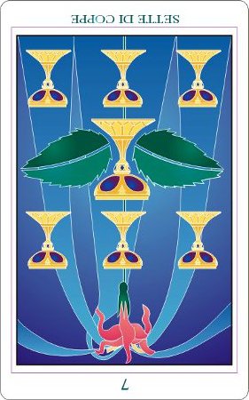 The 7 of Cups is about making a choice between different ideals. But Cups, with the water element, don't like making definitive choices that much, making this 7 in this suit a bit of a hard choice.