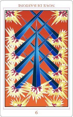 The 9 represents rest after work, which is another thing (like 8) that the element Fire associated with Wands is not very comfortable with. Fire likes to keep going. This rest will probably be spent thinking about what to do next along the course to completion.