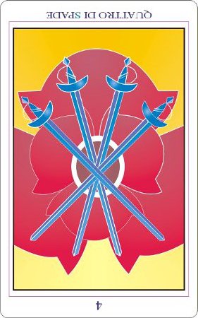 4 is the first number in the cycle of giving things shape. It's about making things real. The element of Swords also relates to making things real, so this enhances the effect so much that arrogance can cause you to exhaust yourself.